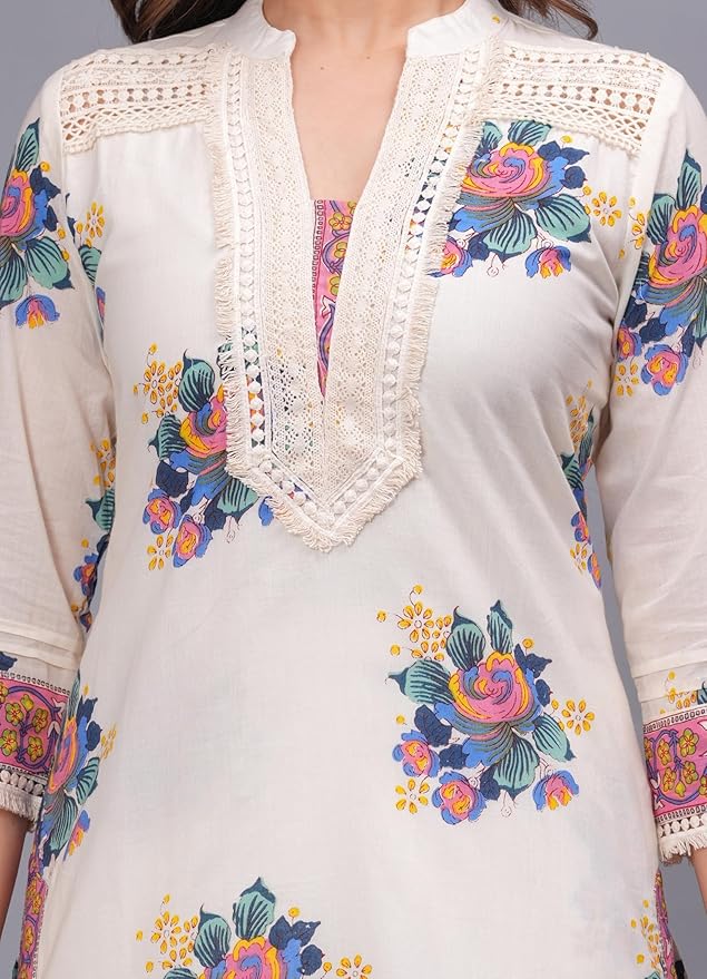 Amayra Women's Pure Cotton Printed Straight Kurta Set with Palazzo Pants & Dupatta- Ethnic Wear, White